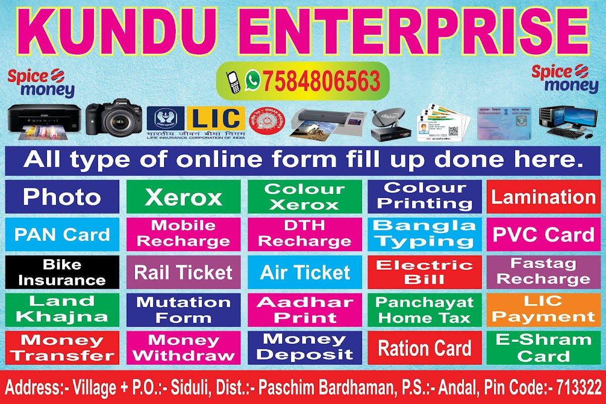 Introducing the menu at KUNDU ENTERPRISE, a one-stop internet café located in Durgapur, West Bengal. This vibrant establishment not only caters to tech-savvy individuals needing online services but also offers an array of printing solutions. Whether you're in need of banners, brochures, or business cards, KUNDU ENTERPRISE has you covered with its custom and digital printing services.